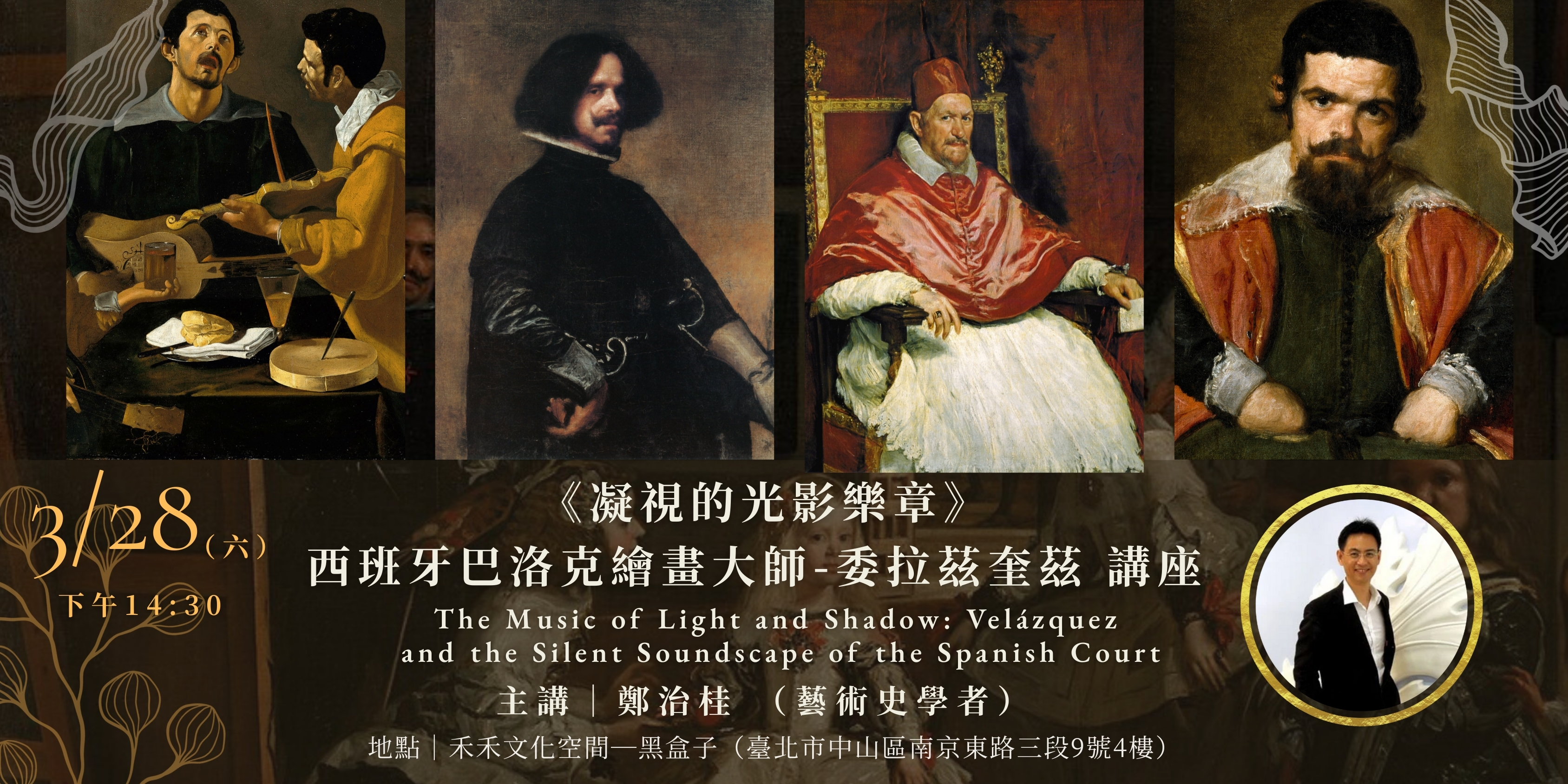 本場講座邀請藝術史學者─來自鄭治桂主講,將從委拉茲奎茲的多件代表性作品出發,探討他如何運用光線與空間,讓畫面成為一種「正在發生」的狀態。畫中的人物不再只是被觀看的對象,而是與觀者形成微妙關係;視線、姿態與位置,構成一種如時間般流動的結構。