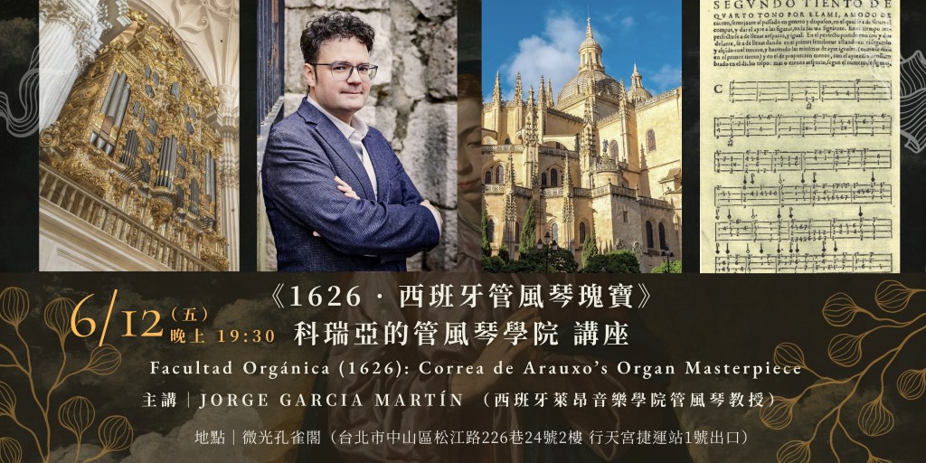 本場講座由西班牙重要歷史管風琴演奏家、任教於萊昂國立音樂院的— Jorge Garcia 主講,Jorge Garcia自幼於 西班牙薩拉曼卡學習管風琴,並赴瑞士巴塞爾古樂學院研習鍵盤古樂與歷史即興,為西班牙歷史管風琴界最重要的演奏家之一。在講座中,他將從歷史管風琴的結構、音栓配置與演奏技法出發,深入解析《Facultad Orgánica》這部伊比利半島的管風琴巨作。