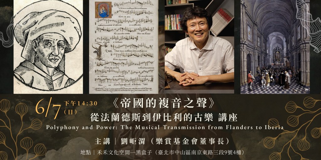 在歐洲文藝復興的音樂史中,「複音音樂」是一套關於時間、秩序與宇宙空間的聲音思維,講座將由樂賞基金會董事長-劉岠渭,帶領聽眾回溯這段由法蘭德斯至伊比利半島的音樂傳承路徑。
